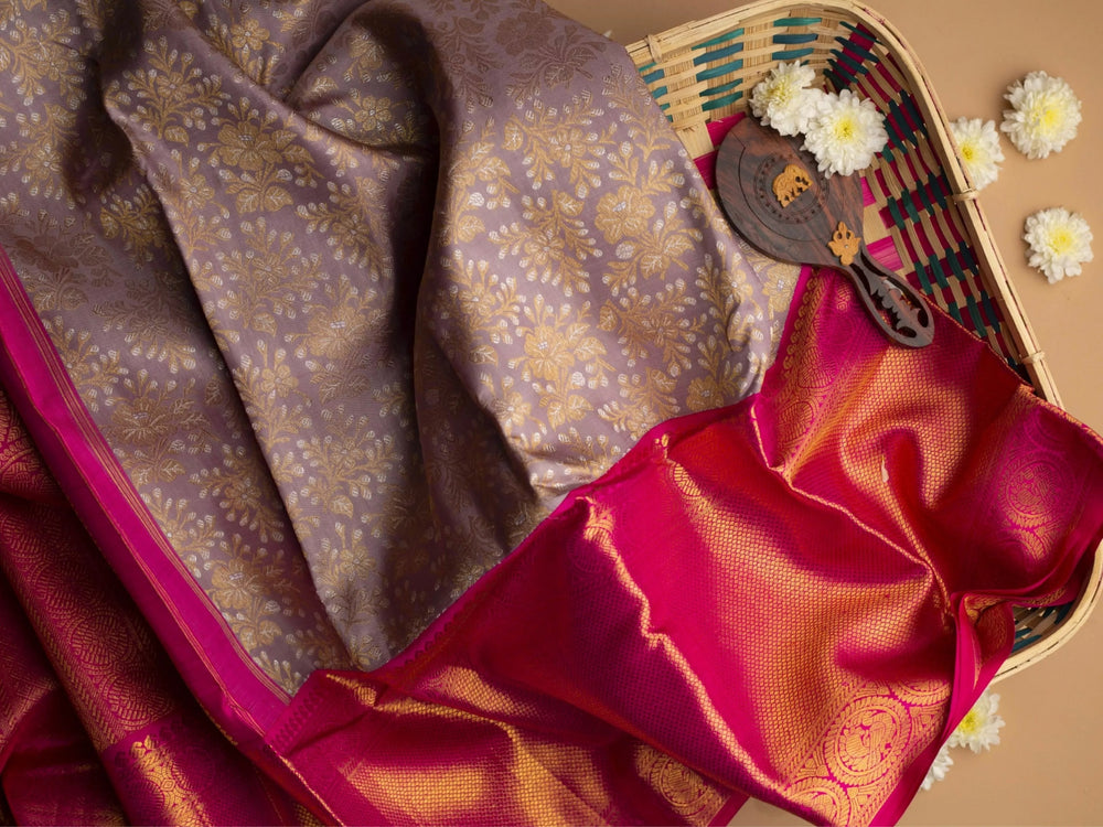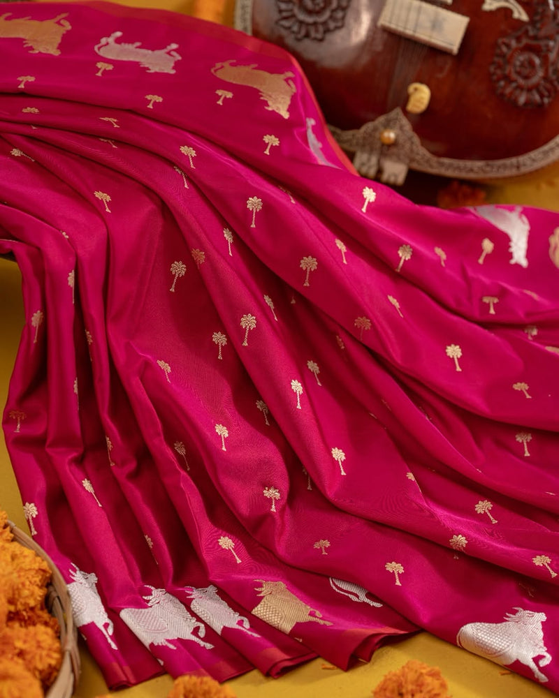 Draped in a stunning rani pink hue, this Banarasi satin saree celebrates heritage with intricate buttas and the divine Kamdhenu motif — a symbol of prosperity and grace. Perfect for those who carry tradition with pride and poise.