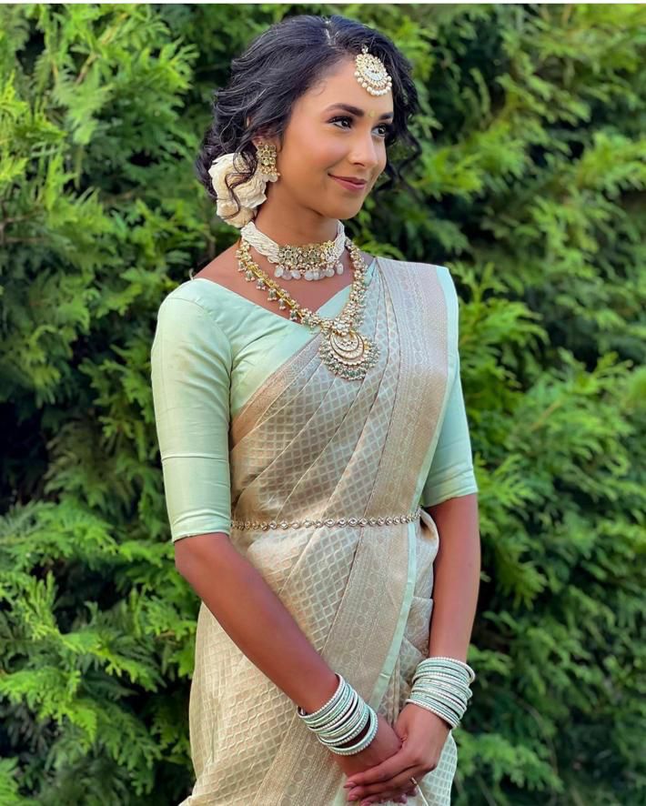 - Paired with a matching unstitched blouse piece with similar weaved Lichi Silk .