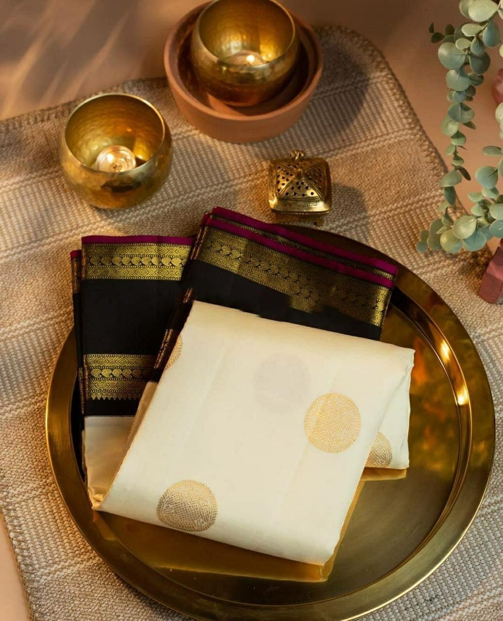 Valiba Reach Silk Cream White Color With Lovely Black Pallu Weaving Jacquard Bengali Saree